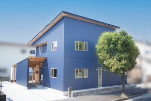 ● 玄関ポーチ下:ブルーの玄関引き戸と杉板のメリハリ感。